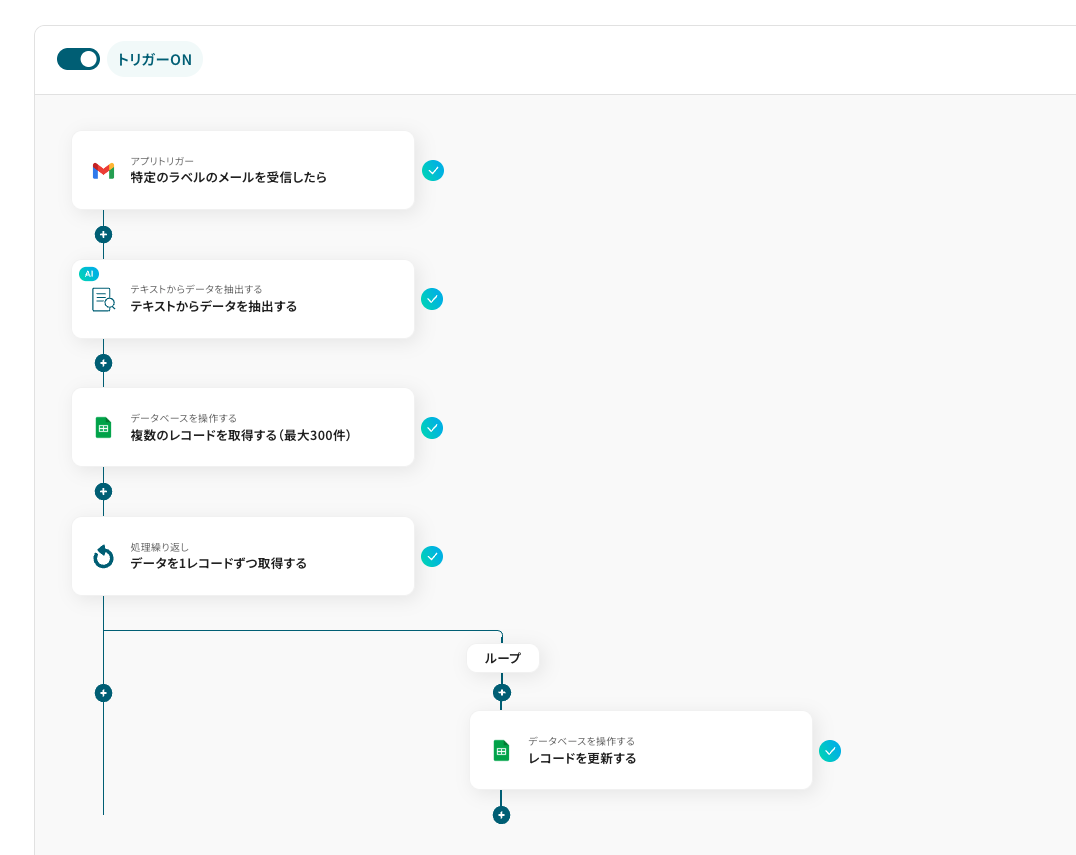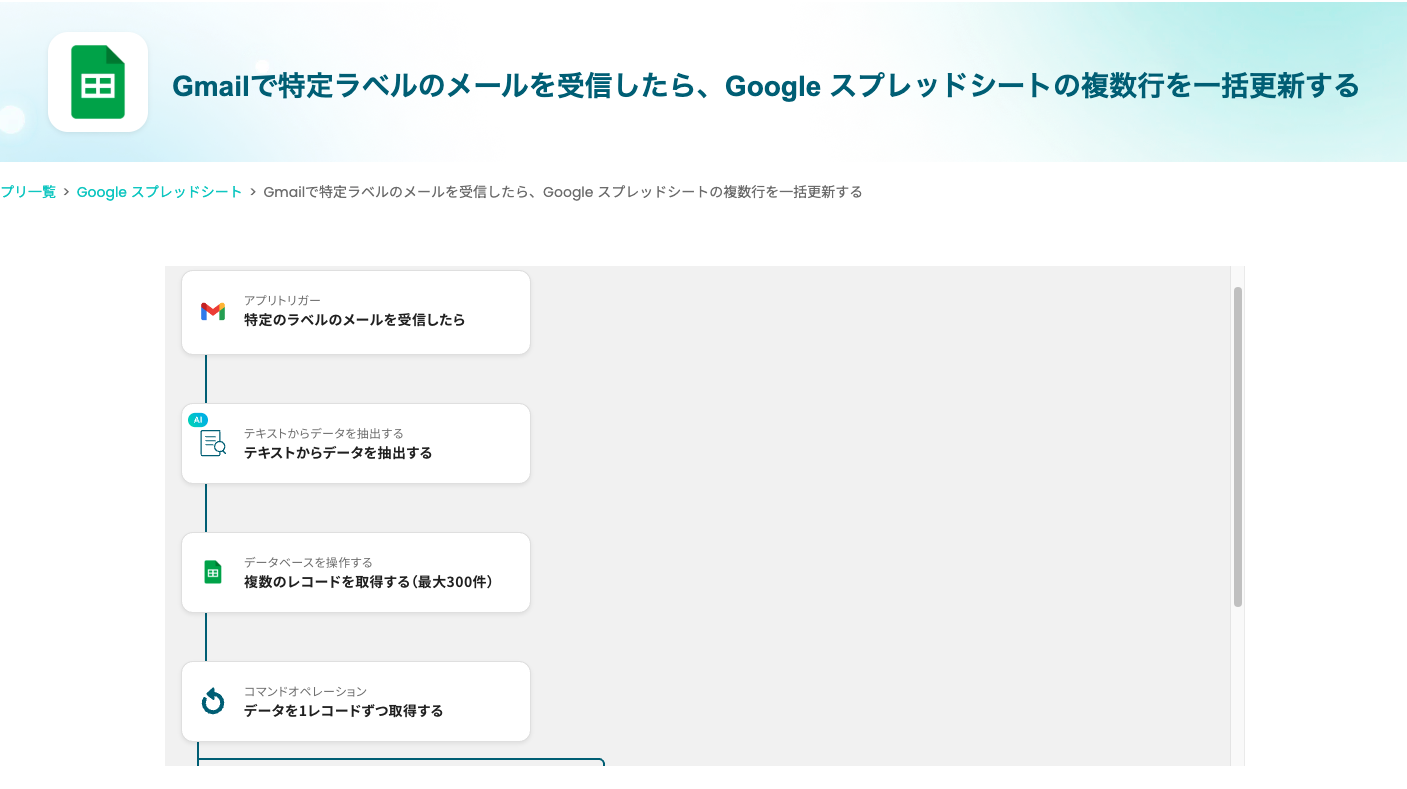 「Gmailで特定ラベルのメールを受信したら、Google スプレッドシートの複数行を一括更新する」フローは、メール管理とデータ更新を自動化する業務ワークフローです。
