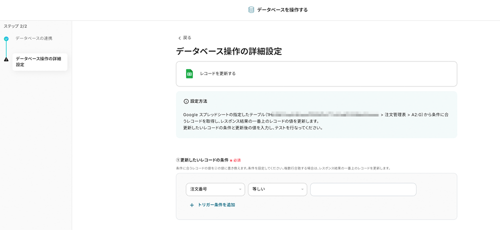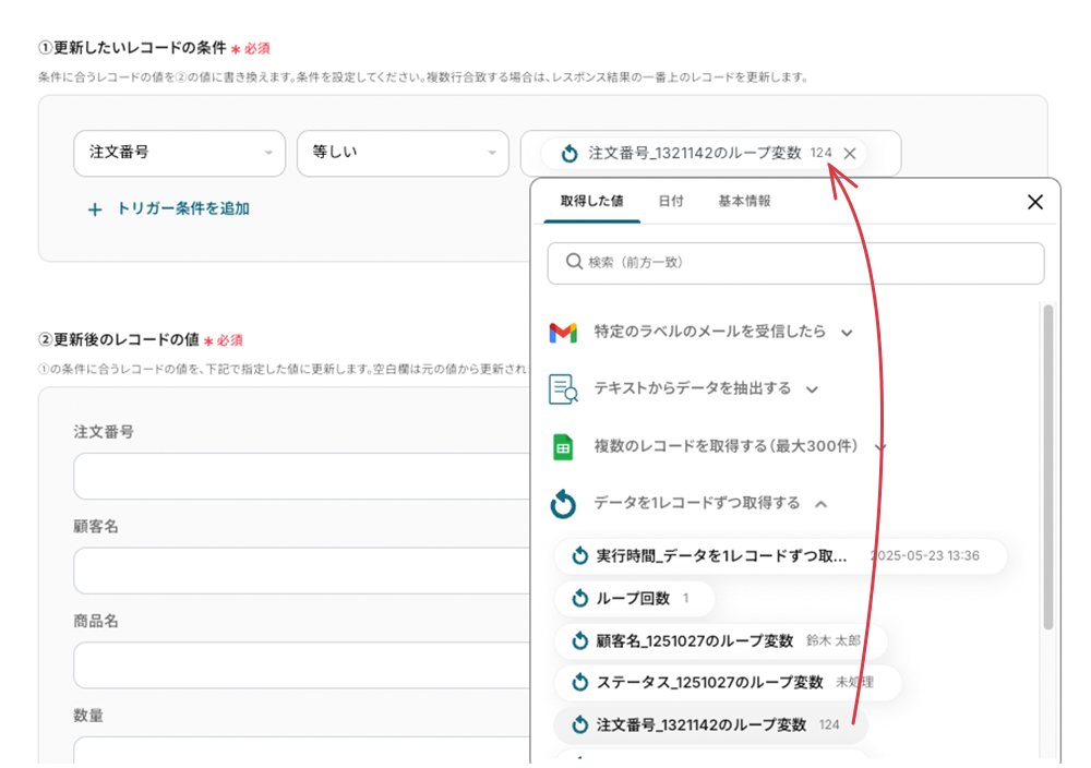 - 前の工程で取得した注文番号(一意の値)を条件に、更新する行を取得します。