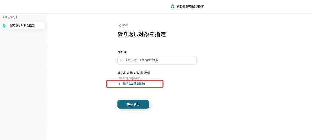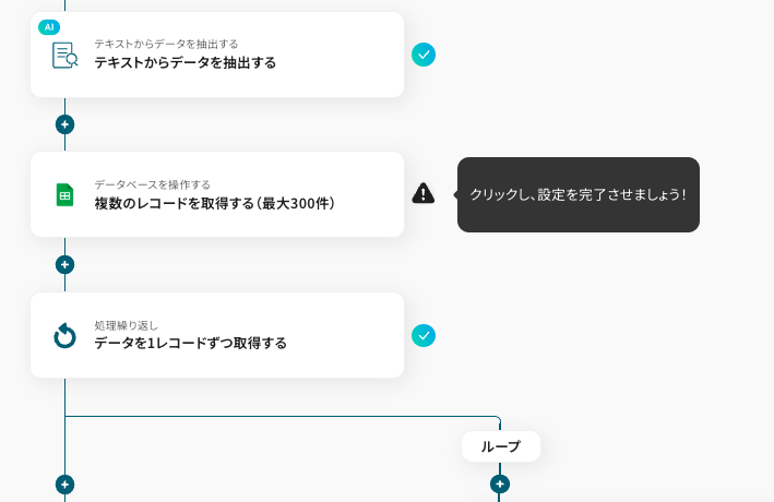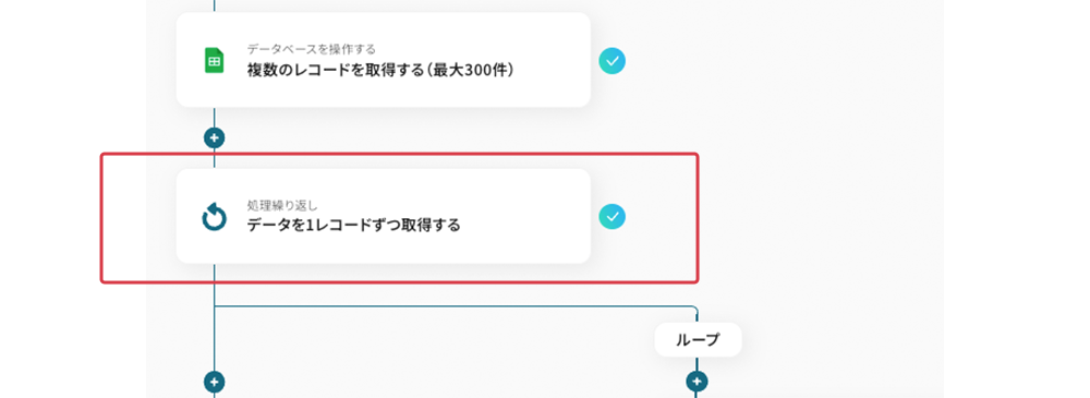 テンプレートの4つ目をクリックします。データを取得する際、特定の条件に合致する複数のレコードが返されることがあります。これらをまとめて処理することは難しいため、「繰り返し」機能を使って、レコードを一件ずつ処理する設定です。