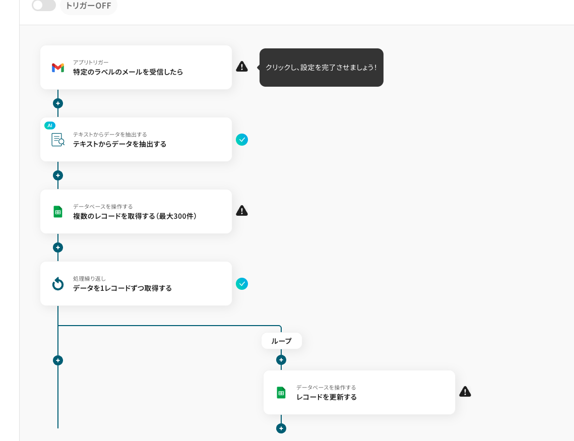 それではここから代表的な例として、Gmailで特定のラベルが付いたメールを受信したら、その情報をもとにGoogle スプレッドシートの複数行を一括で更新するフローを解説していきます!