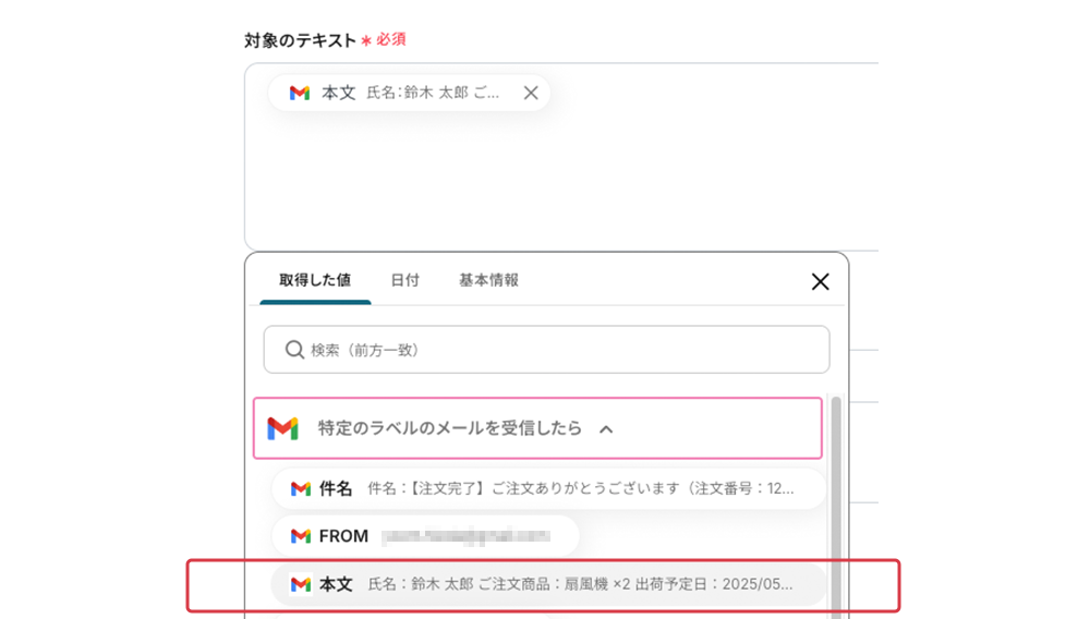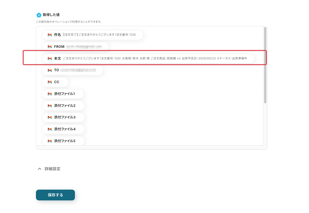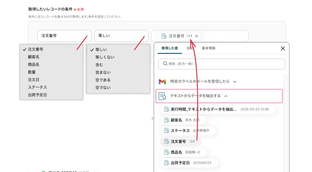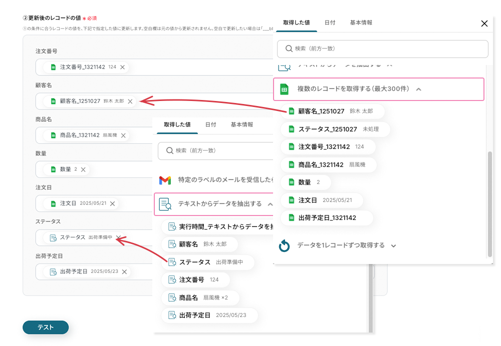 ステータスと出荷予定日は、Gmailから抽出した値を紐付けます。