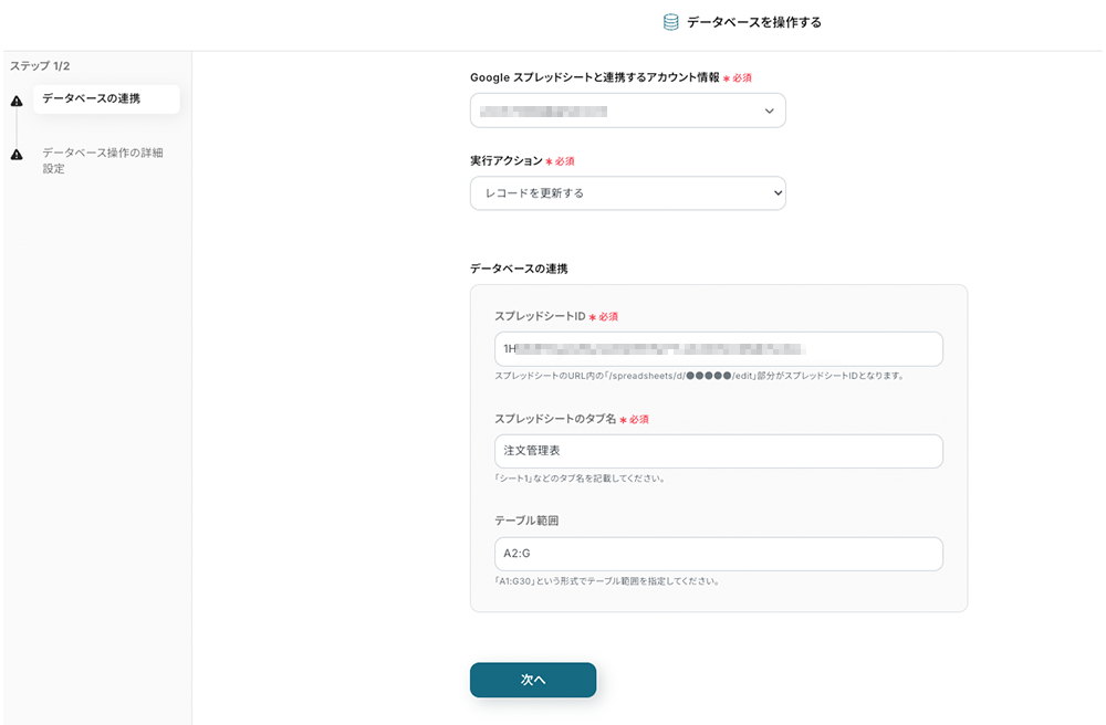 Notionで変更された情報が自動的にGoogle スプレッドシートに反映され、対応する複数行の更新を一度に実行できます。