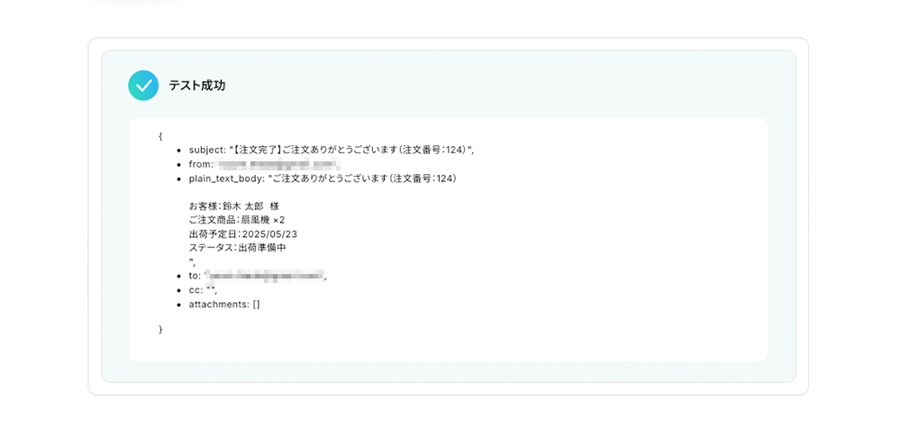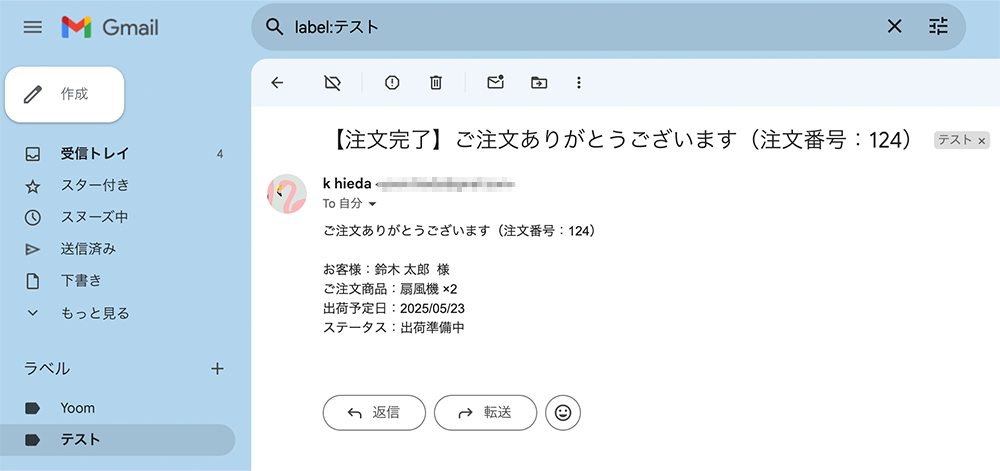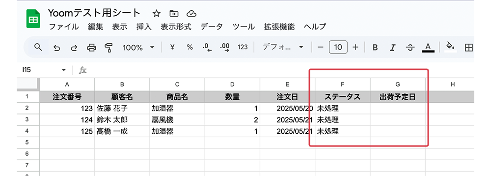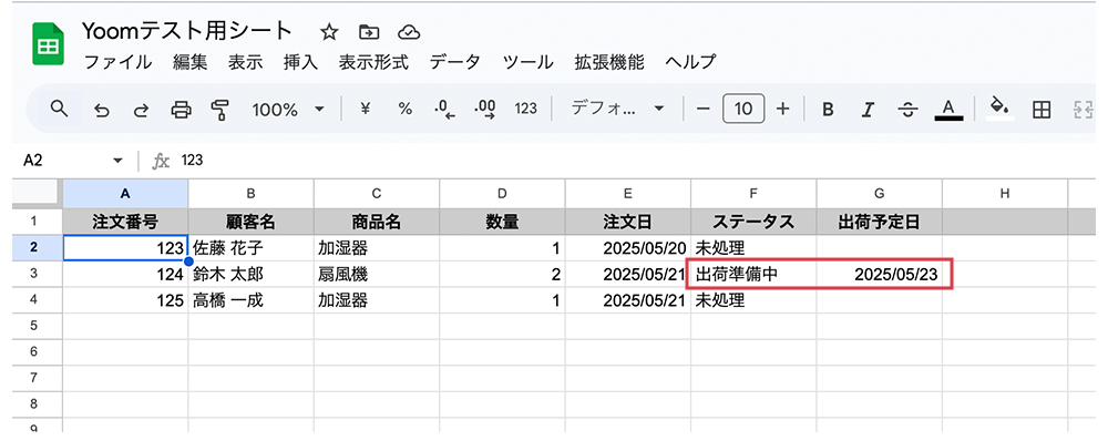 サンプルケースとしてECや受注業務で、Gmailで届く注文完了メールに記載された注文番号や商品名を読み取り、それに対応するスプレッドシート内の注文管理表のステータスや出荷予定を自動更新するシーンを想定します。