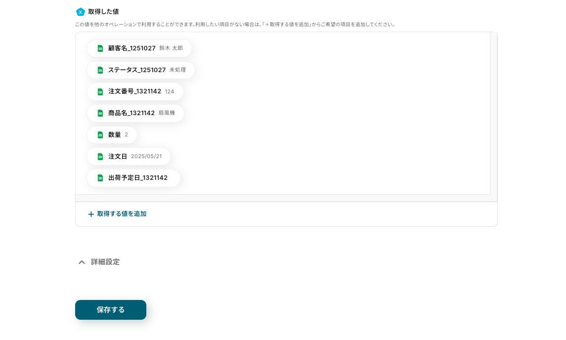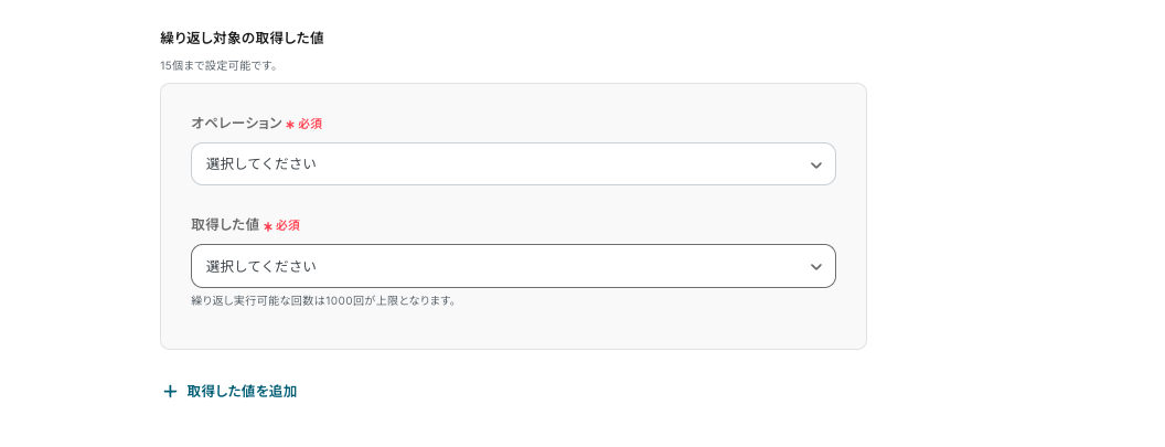 【+取得した値を追加】ボタンをクリックします。以下のフィールドが表示されます。
