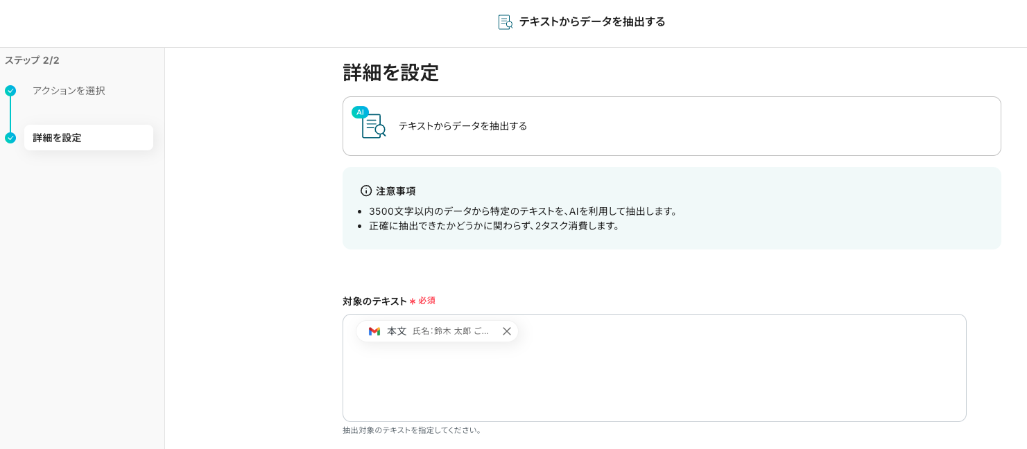 - こちらは、前の工程で取得した値から項目を選択します。全て(案件・顧客名・担当者・金額)を設定します。