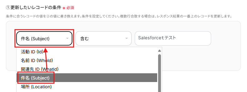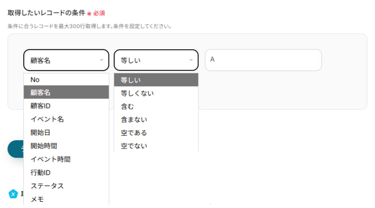 - 更新したいレコードの条件:取得した情報を通知するレコードを以下のように指定します。