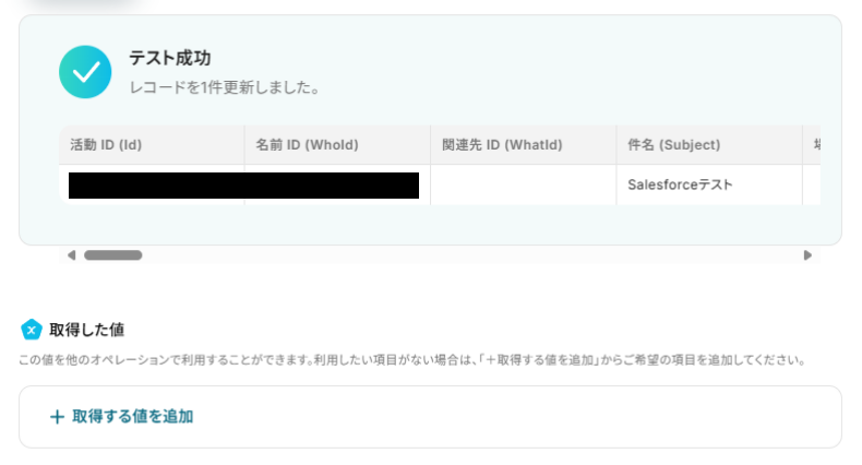 - 更新後のレコードの値:レコードに追加したい情報を、前の工程で取得した値から選択してください。
