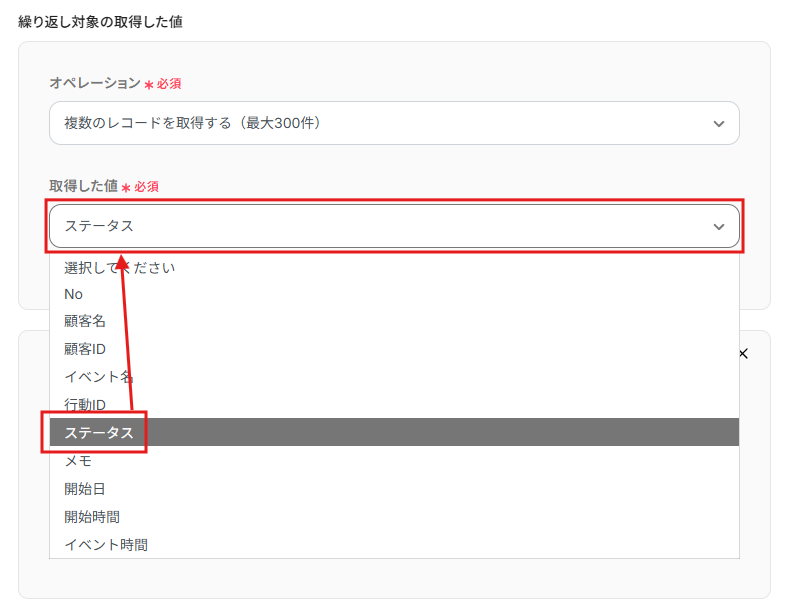- 取得した値:入力欄をクリックして、繰り返し対象にしたい項目を選択しましょう。