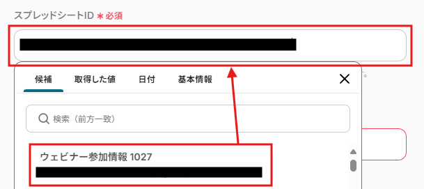 - スプレッドシートID / スプレッドシートのタブ名:入力欄をクリックすると候補が表示されるので、該当するものを選択してください。