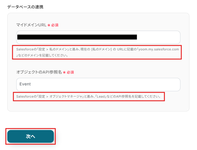 - マイドメインURL / オブジェクトのAPI参照名:赤枠内の指示に従って記載してください。