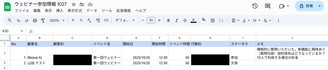今回は「ウェビナーを定期開催しており、参加者情報をGoogle スプレッドシートで一元管理している」という設定で、以下のようにシートを作成しました。