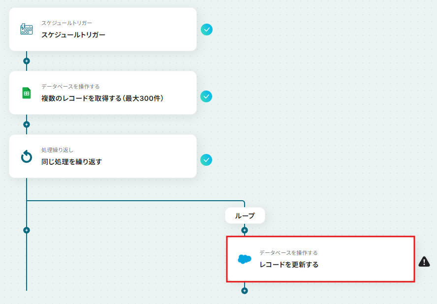 このステップは、複数のレコードを繰り返し機能を使って一件ずつ処理する設定です。