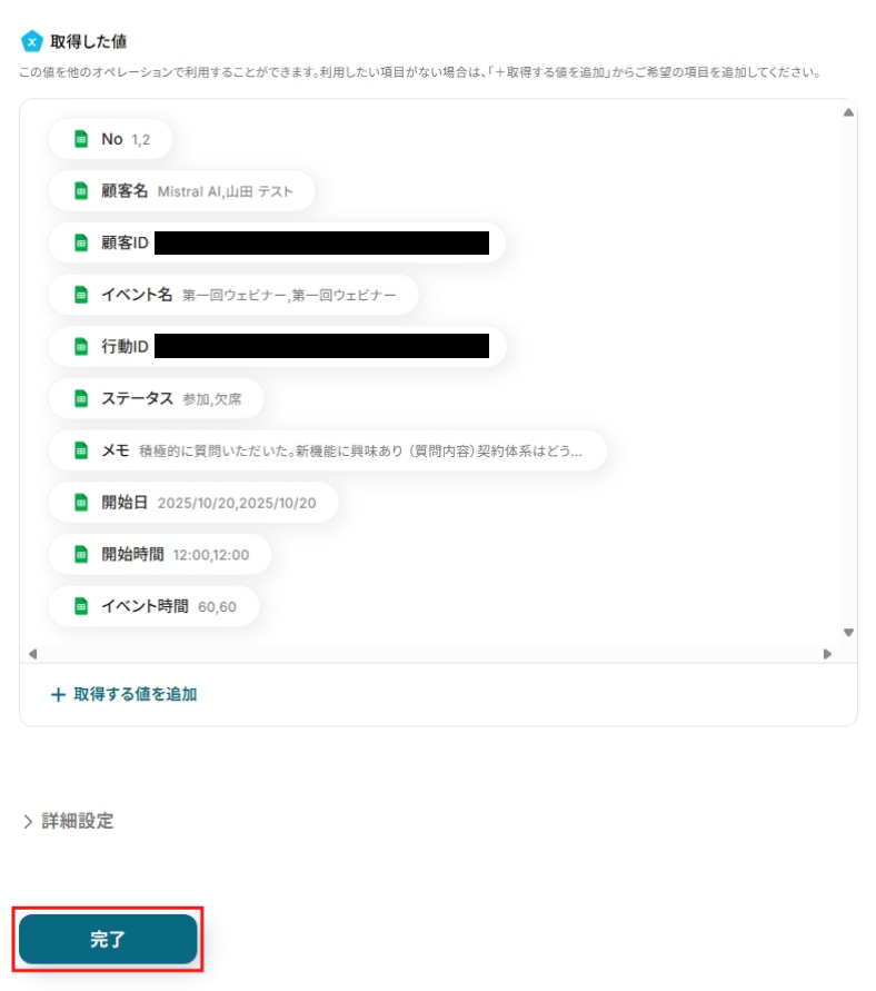 ここまで確認したらYoomの画面へ戻り、「完了」をクリックします。