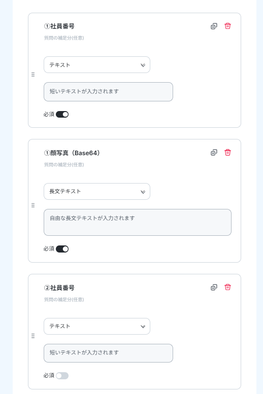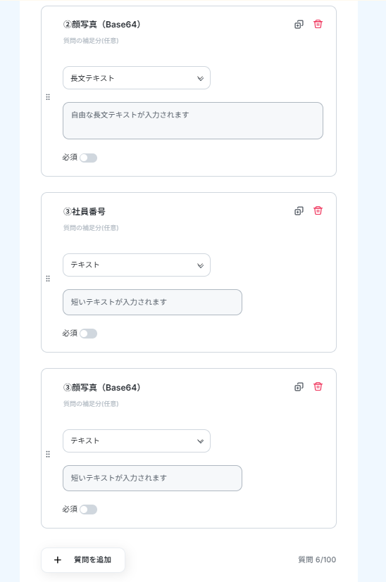 今回はデフォルトで「社員番号」「顔写真(Base64)」が入力できるフォームとなっています。質問を追加したい場合は「質問を追加」から行ってください。