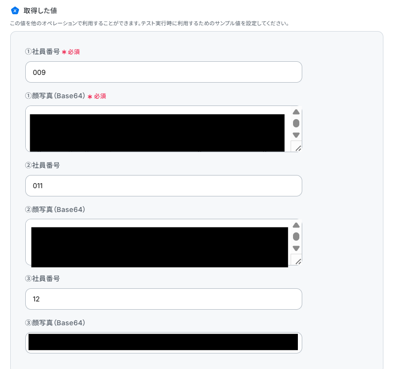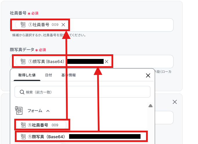 「社員番号」「顔写真データ」は前ステップで取得した値から入力しましょう。