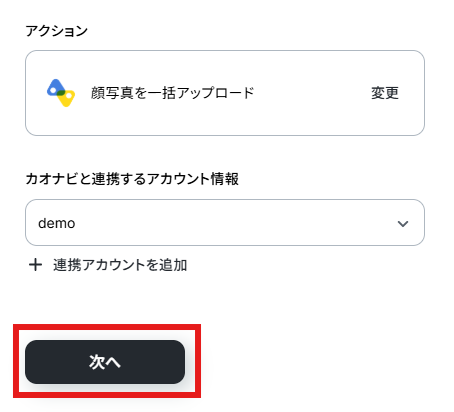 アクションはデフォルト設定のまま、アカウント情報は、連携したいアカウントが選択されているか確認してください。確認が終わったら「次へ」で進みましょう。