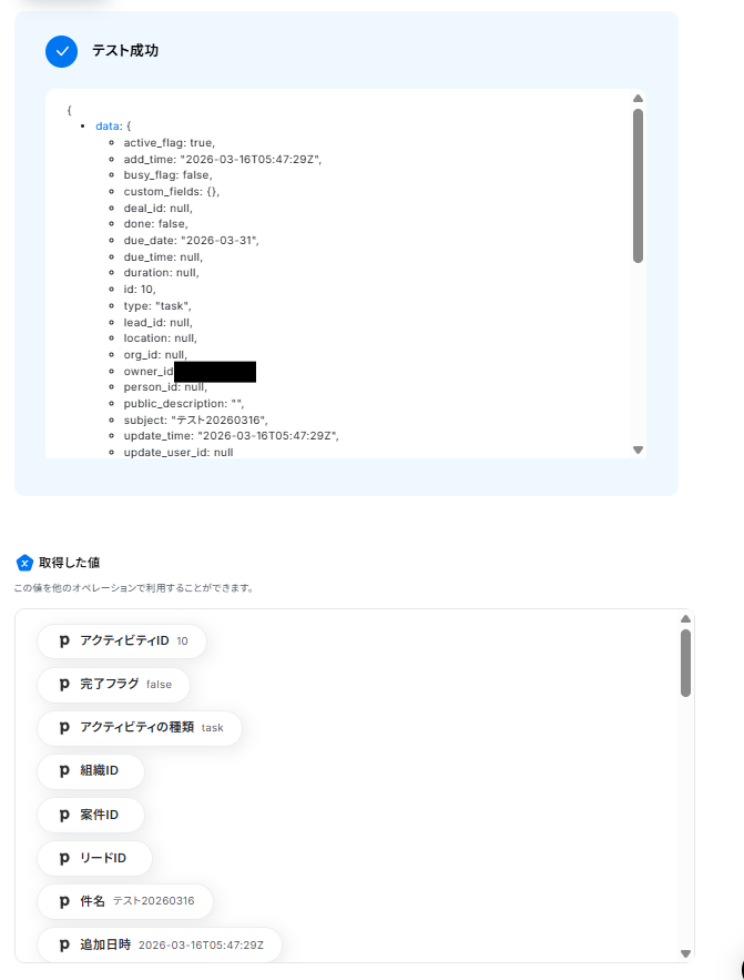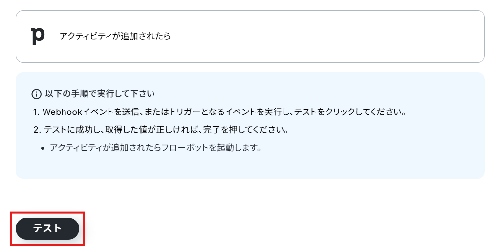 Pipedriveにアクティビティを追加できたら、Yoomの画面に戻ってテストを行いましょう。