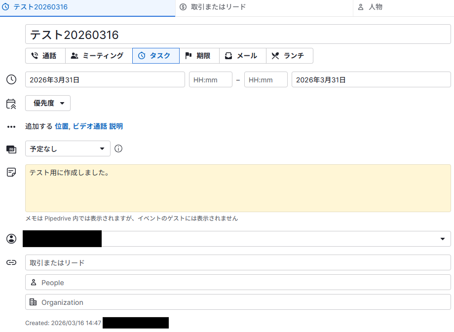 Pipedriveには、以下のようなテスト用のアクティビティを追加しましょう。