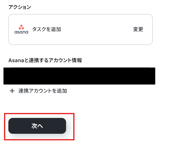 「Asanaと連携するアカウント情報」を確認し、「次へ」をクリックして進んでください。