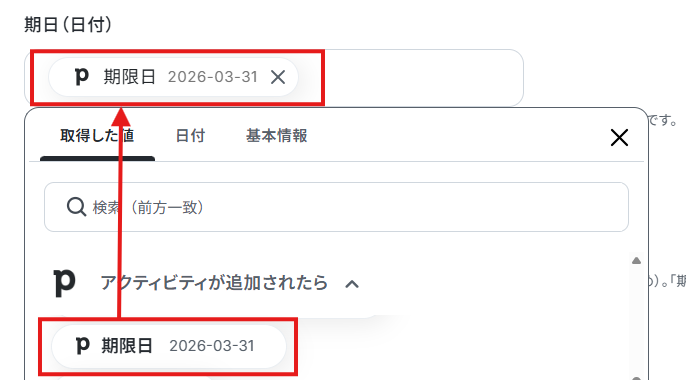 - Pipedriveで作成するアクティビティの件名や期限などの各項目には、固定のテキストを設定したり、前段のオペレーションで取得した情報を変数として埋め込んだりするカスタムが可能です