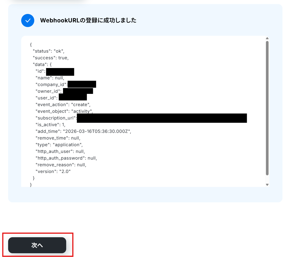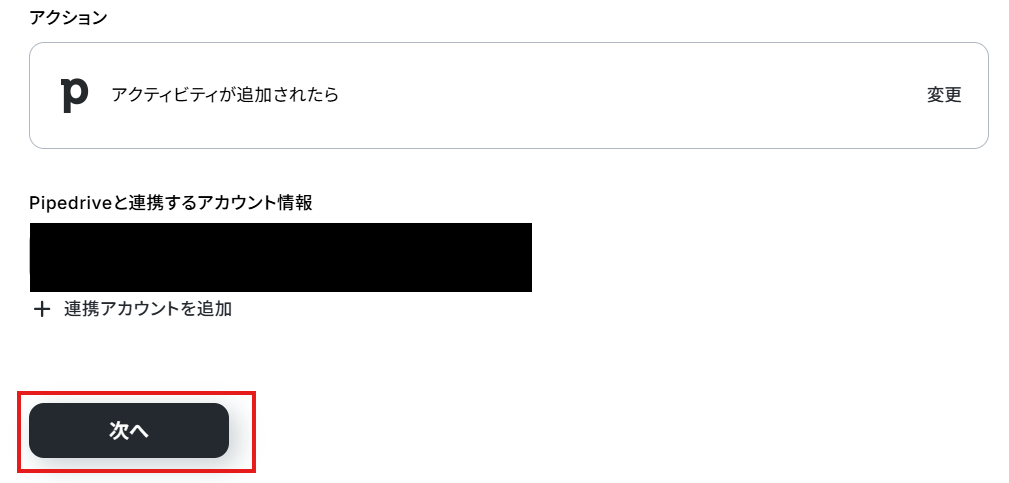 「Pipedriveと連携するアカウント情報」を確認し、「次へ」をクリックして進んでください。
