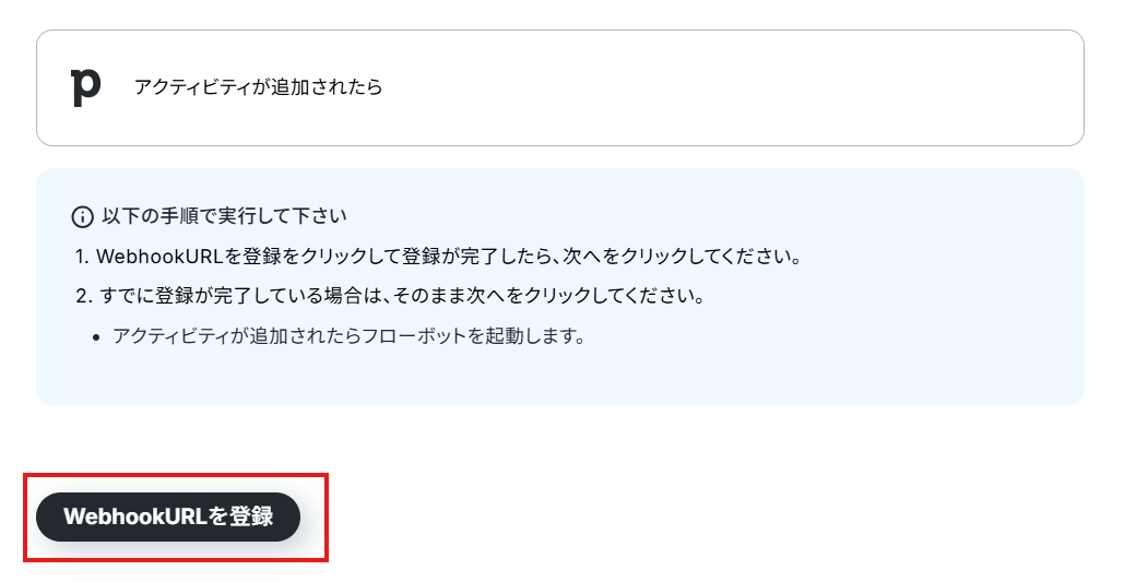 - Pipedriveのトリガー設定では、Yoomのフローボットで発行されるWebhook URLをPipedriveのアカウントに登録する必要があります。