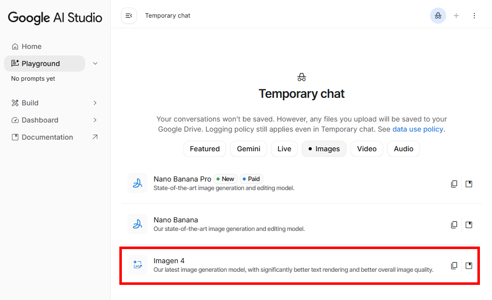 手順 Google AI Studioにログインし、「Playground」から「Imagen 4」を選択します。