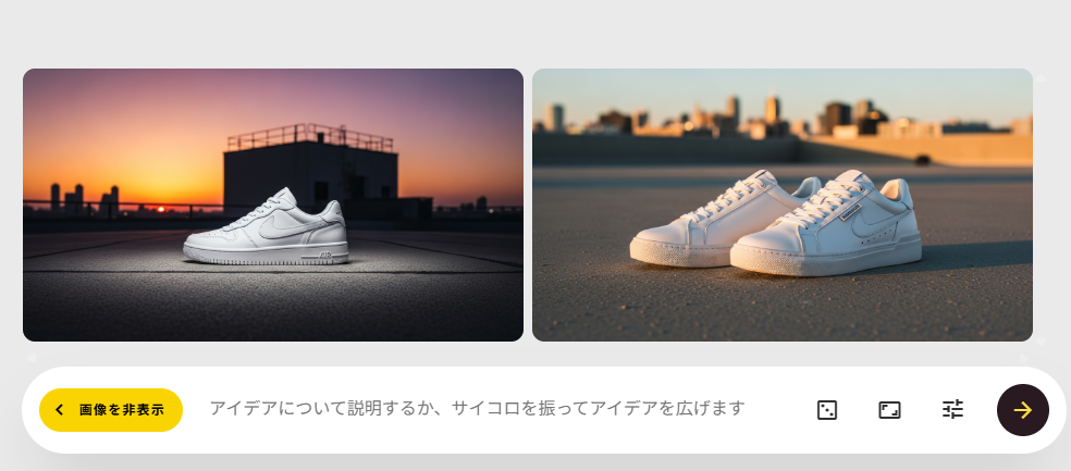 都会の背景に映えるスニーカーの画像が、写真のクオリティで生成されました。 まるでプロのようにモデルとなるスニーカーにピントを当てており、ファッション雑誌に掲載されている広告のようです。テキストだけで複数の画像が自然になじむように指示するのは大変ですが、Whiskなら画像を選んで「混ぜる」だけ。 センスに自信がなくても、素材を選ぶだけでクオリティの高い画像が作れる手軽さが魅力です。