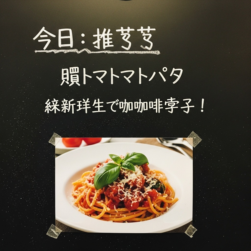 お洒落なカフェの黒板メニュー。手書き風の白い文字で「本日のおすすめ:完熟トマトのパスタ。挽きたてコーヒーと一緒にどうぞ!」とはっきりと書かれている。文章の下には美味しそうなパスタの写真がある。