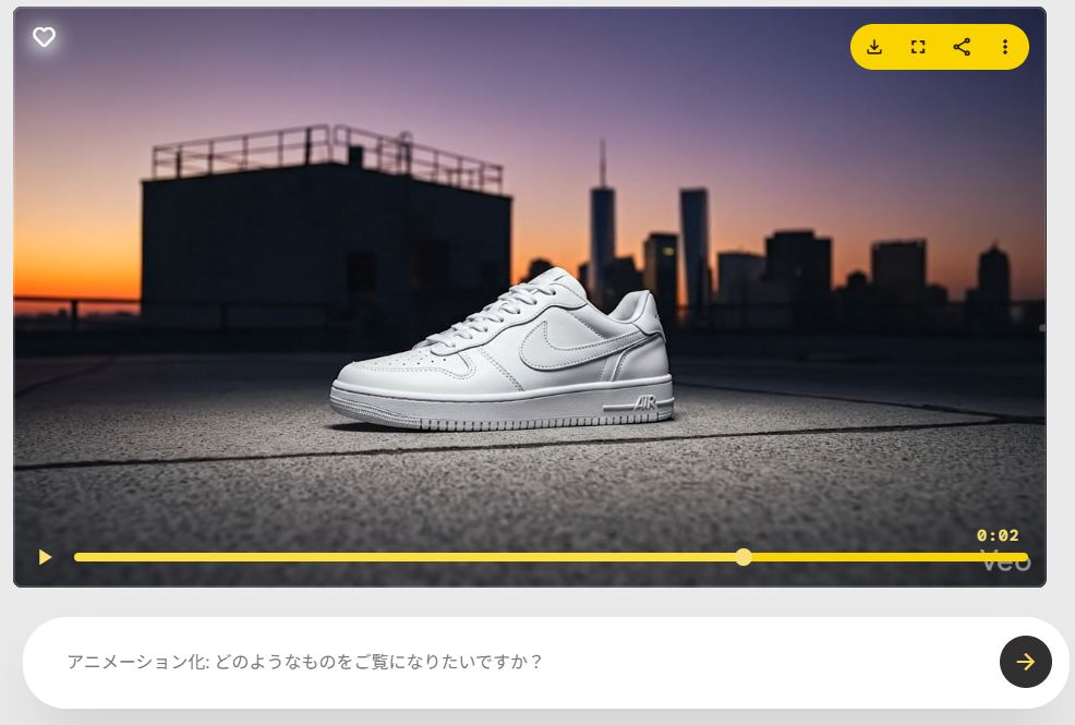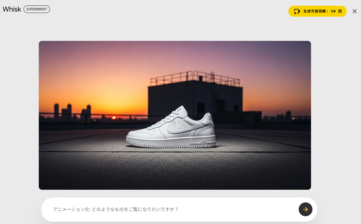 また、生成画像の「アニメーション化」ボタンから、動画生成AI「Veo 3」により8秒の短い動画も生成できました。 スニーカーの周囲をカメラが回るような動きが加わり、プロが撮影したような広告動画になっています。 生成した画像から動画を作成したい場合、Whiskはかなり相性が良いUIです。