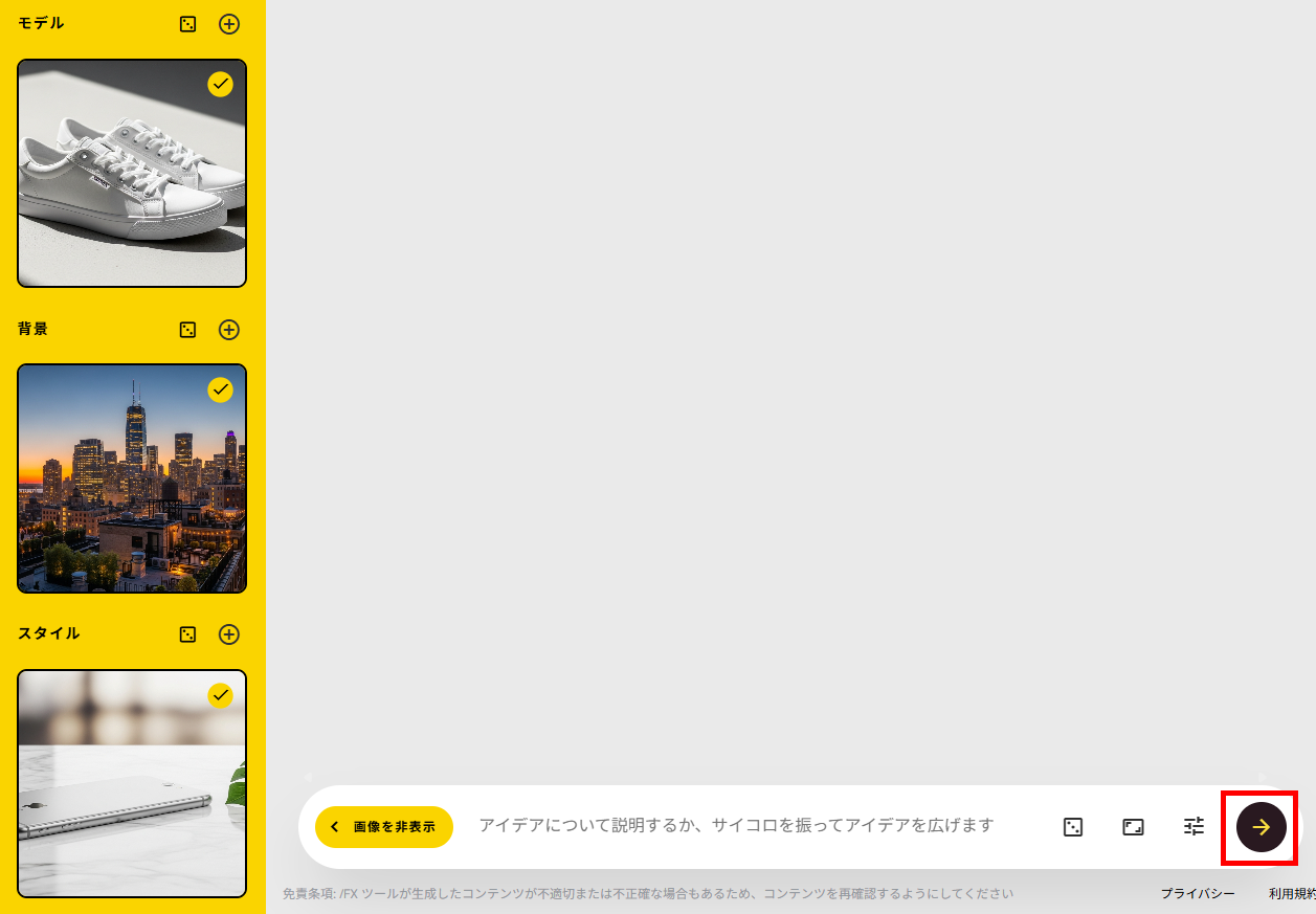 「背景」に「都会の夕暮れの屋上」、「スタイル」に「プロの製品写真」を同様の手順で設定したら、右矢印をクリックします。
