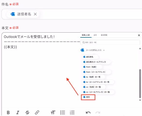 - 「本文」→任意の内容とアウトプットから選択可能です。