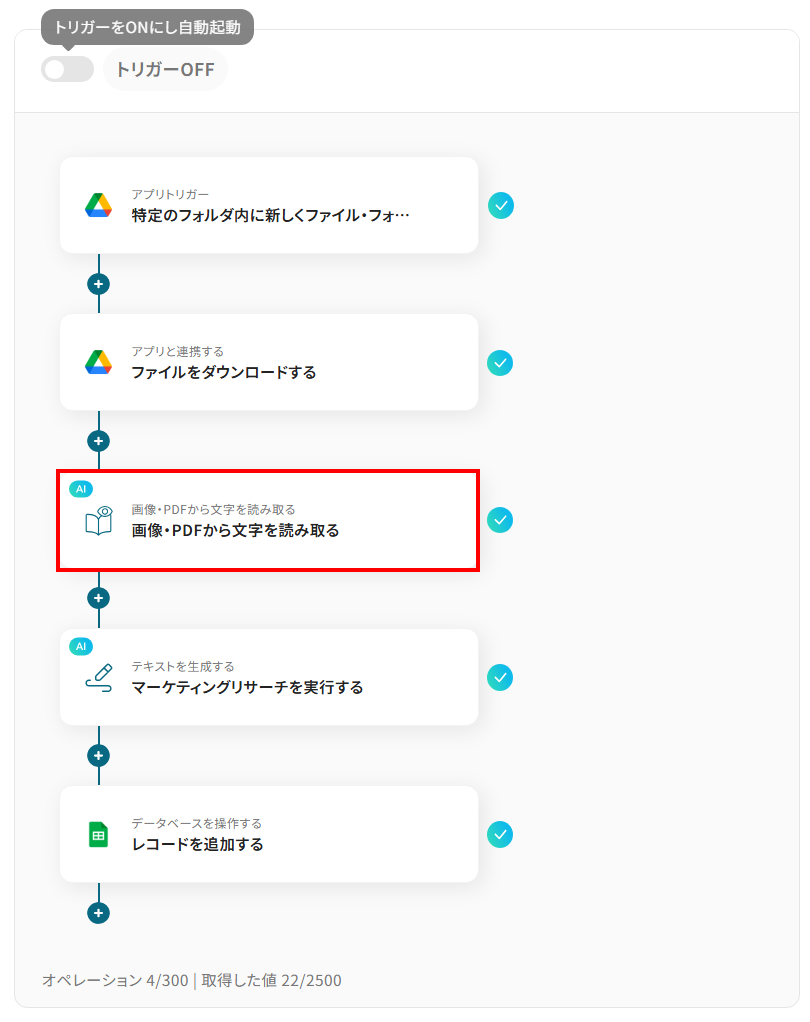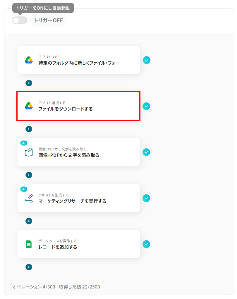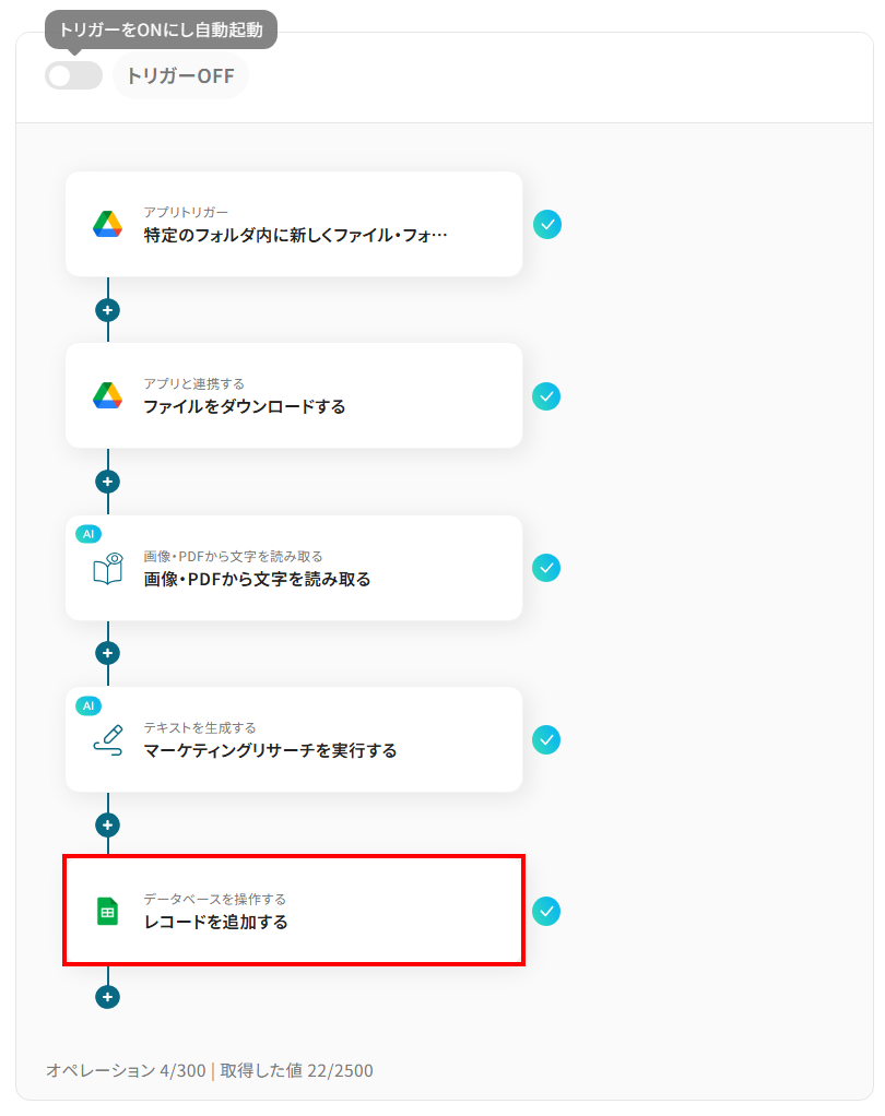 Google Driveなどのストレージサービスに保存された顧客アンケートやインタビュー記録といったデータをトリガーとして、AIが内容を分析しマーケティングリサーチを行い、その結果を表計算ソフトなどに自動で集約する ことができるので、散在しがちな顧客の声を一元管理し、貴重なインサイトを見逃すことなく活用できます。