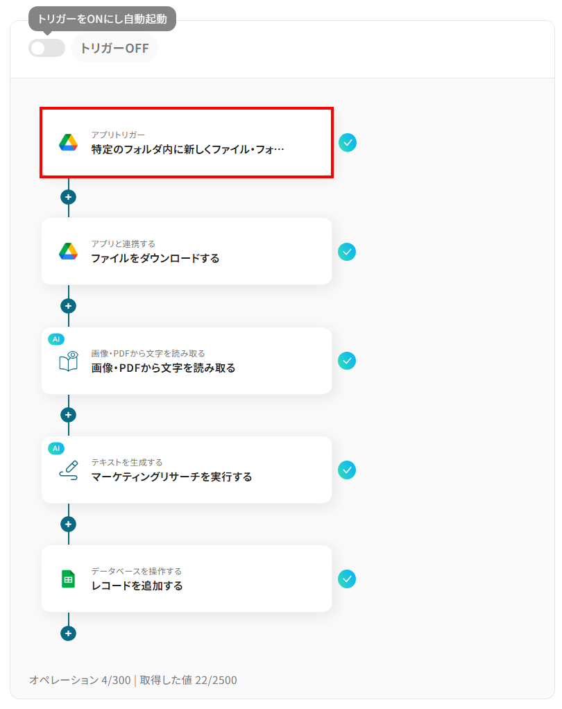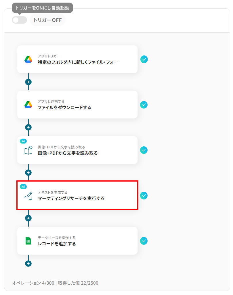 Google Driveに顧客アンケートの一覧が格納されたら、AIで潜在的な課題をマーケティングリサーチし、Google スプレッドシートに追加する