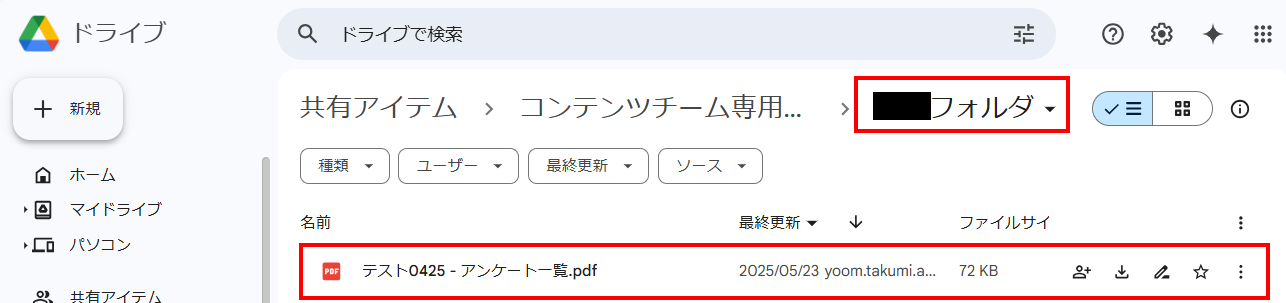 3.ここでは、トリガーとなるGoogle Driveの設定をします。 まだ、トリガーとなるGoogle Driveのフォルダを準備していない場合は、このタイミングで作成してください。 今回は、下記のようなフォルダを作成しました。 また、この後のテスト操作で、対象のフォルダに新しくファイルかフォルダの作成が必要なので、こちらも合わせて行ってくださいね。