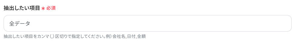 追加で抽出したい項目:対象のファイルから抽出したい項目を入力しましょう。複数ある場合はカンマ区切りで指定してください。今回は、全てのデータを抽出したいので下記のように設定しました。