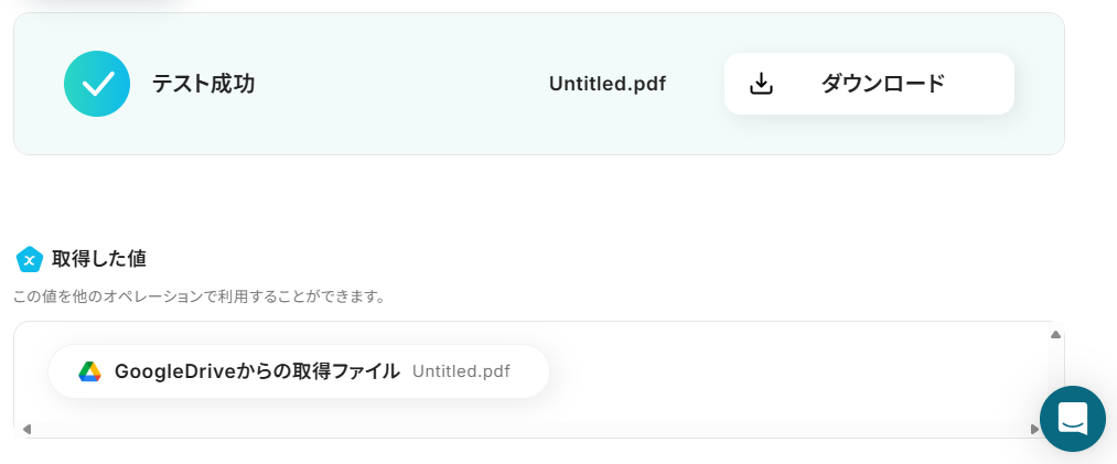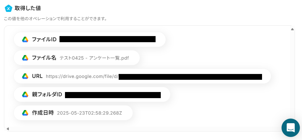 3.ここでは、Google Driveに保存されているファイルの指定を行います。 ファイルIDの入力欄をクリックし「取得した値」タブを選択すると、下記のようなアウトプットが表示されます。 先ほど取得したGoogle DriveのファイルIDを選択しましょう。 ※アウトプットについて詳しくはこちら をご覧ください。 ※ダウンロードできるファイルの容量は最大300MBです。ただし、アプリの仕様によっては300MB未満になることがあるので、ご注意ください。 ※その他トリガーや各オペレーションで扱えるファイル容量の詳細については、以下もチェックしてみてください。 https://intercom.help/yoom/ja/articles/9413924