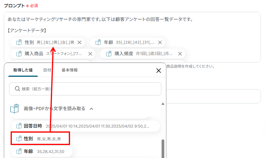 3.ここでは、AIに対しての具体的な指示を設定します。 プロンプト欄をクリックすると、下記のようなアウトプットが表示されるので、先ほど生成したテキストを選択しましょう。