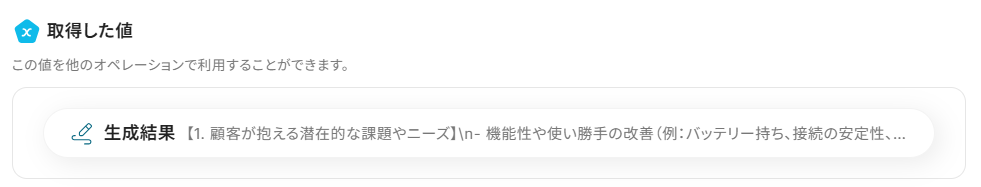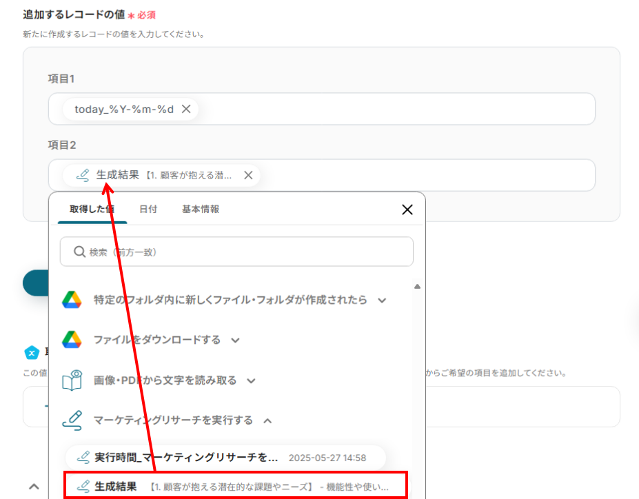 3.ここでは、Google スプレッドシートのどの項目にデータを追加するか設定をします。 「追加するレコードの値」のそれぞれ入力欄をクリックすると、下記のようなアウトプットが表示されます。 テキスト生成結果を選択したり、アウトプットを活用して入力してください。