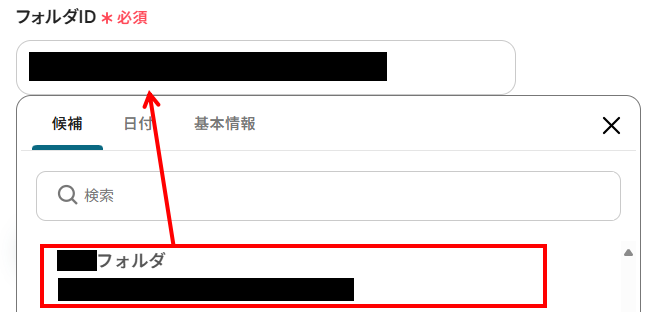 フォルダID:入力欄をクリックすると下記のような候補が表示されます。先ほど作成したGoogle Driveのフォルダを選択しましょう。