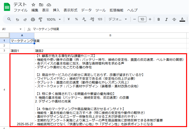 毎週Google スプレッドシートの業務データを取得し、AIでマーケティングリサーチを行ってシートに追加する