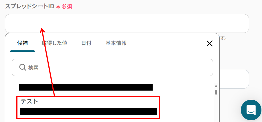 スプレッドシートID:入力欄をクリックすると候補一覧が表示されますので、先ほど作成したGoogle スプレッドシートを選んでください。
