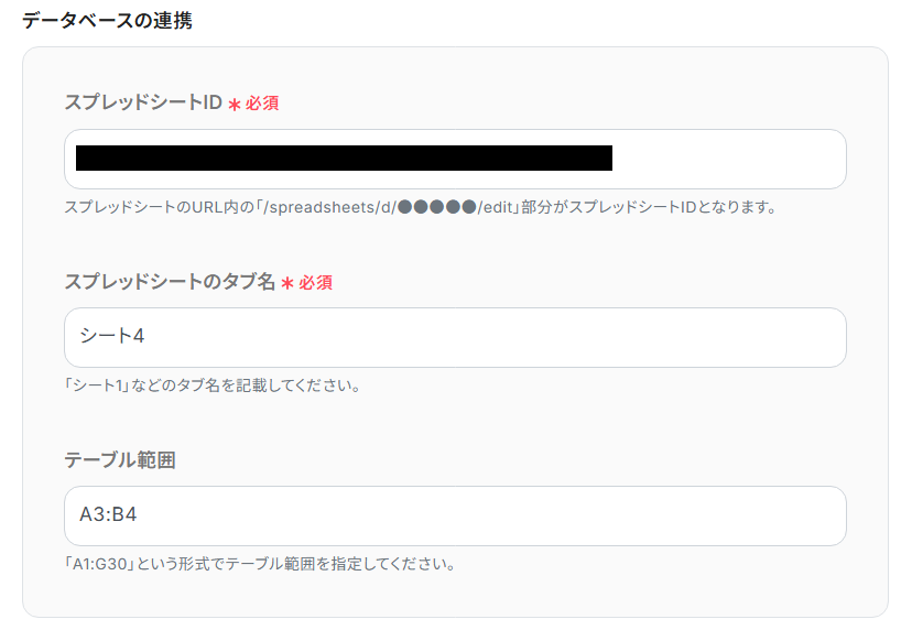 スプレッドシートのタブ名:スプレッドシートIDと同じように、入力欄をクリックすると選択肢が出るので、該当するシートを選択しましょう。