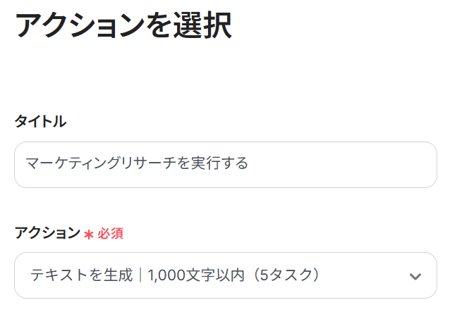 アクションは、デフォルトで「テキストを生成|1,000文字以内(5タスク)」が選択されています。こちらは変更可能なので、()内に表記されている消費タスク量に注意して選択してください。 設定が完了したら、「次へ」をクリックして進みましょう。