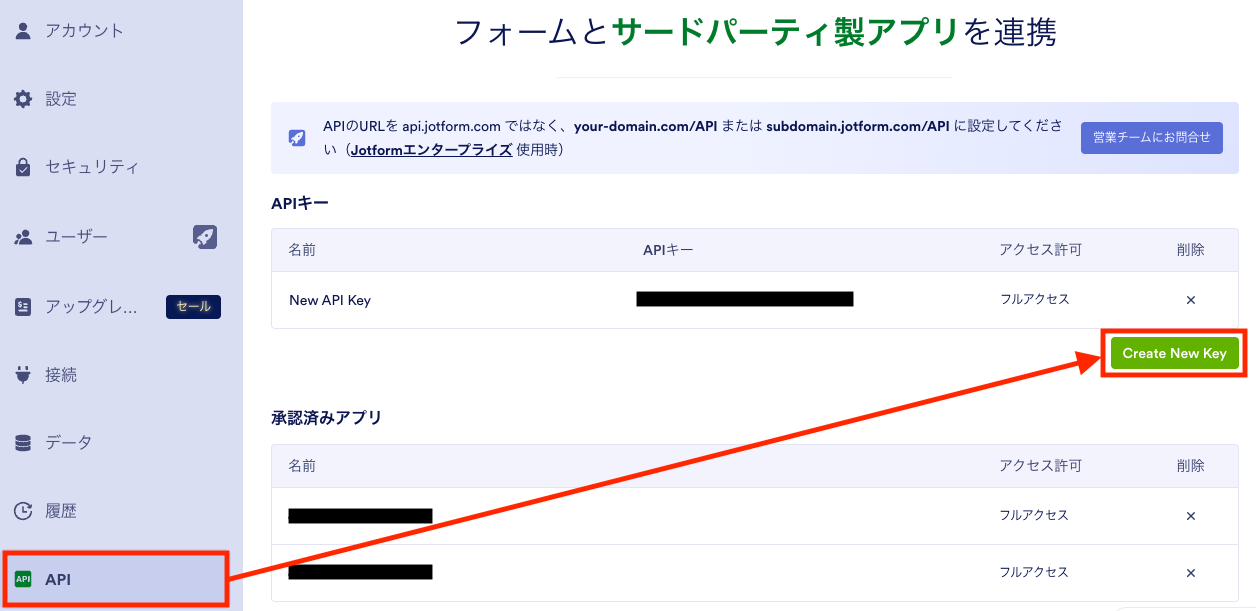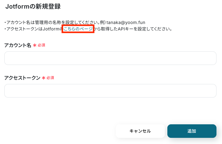 新規登録画面が開いたら、「こちらのページ」からJotformのAPIページにアクセスします。