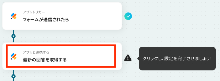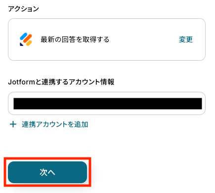 - 次に、オペレーションでJotformの「最新の回答を取得する」アクションを設定し、送信されたフォーム情報を取得します。