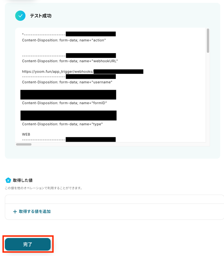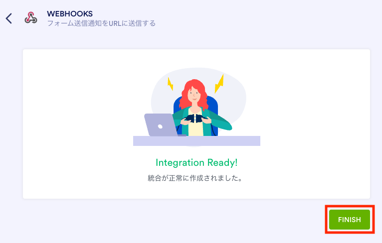 最後に「FINISH」をクリックしたら、Webhookの受信設定は完了です。