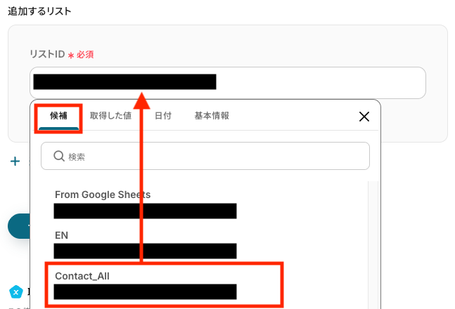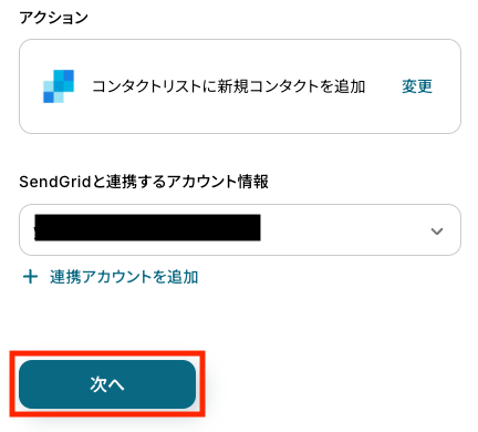 - 最後に、オペレーションでSendGridの「コンタクトリストに新規コンタクトを追加」アクションを設定し、取得した情報を任意のコンタクトリストに追加します。
