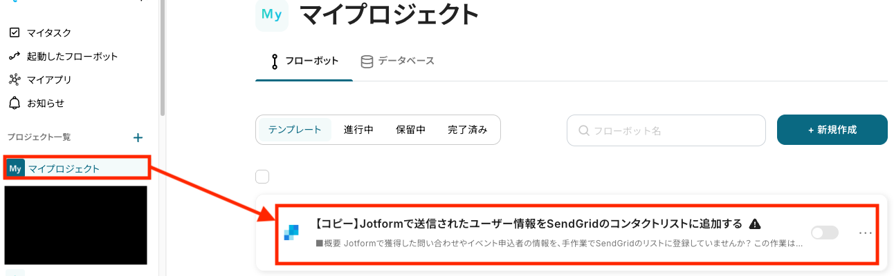 マイプロジェクトから、「【コピー】Jotformで送信されたユーザー情報をSendGridのコンタクトリストに追加する」を選択してください。