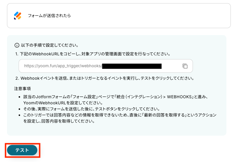 詳しい設定方法は、「JotformのWebhook設定と最新回答取得方法について 」をご参照ください。